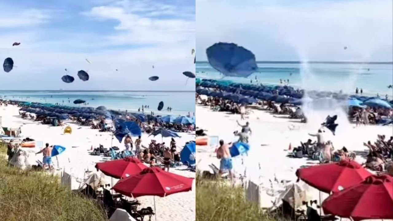 The video opens peacefully: rows of umbrellas planted under a cloudless blue sky, families lounging in chairs, and waves rolling gently ashore. Then, out of nowhere, a gust of wind forms into a swirling dust devil, ripping through the beach and sending umbrellas twirling skyward.